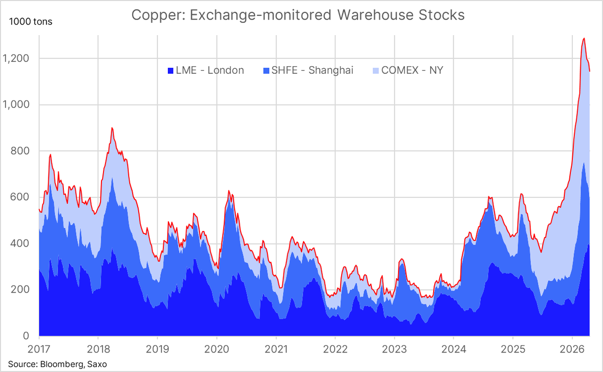 Global #copper stockpiles monitored across the three major futures exchanges fell for a fifth consecutive week, declining by 36 kt to 1,144 kt. The drawdown continues to be driven by a rapid reduction in China, where SHFE inventories have more than halved over the period to 201
