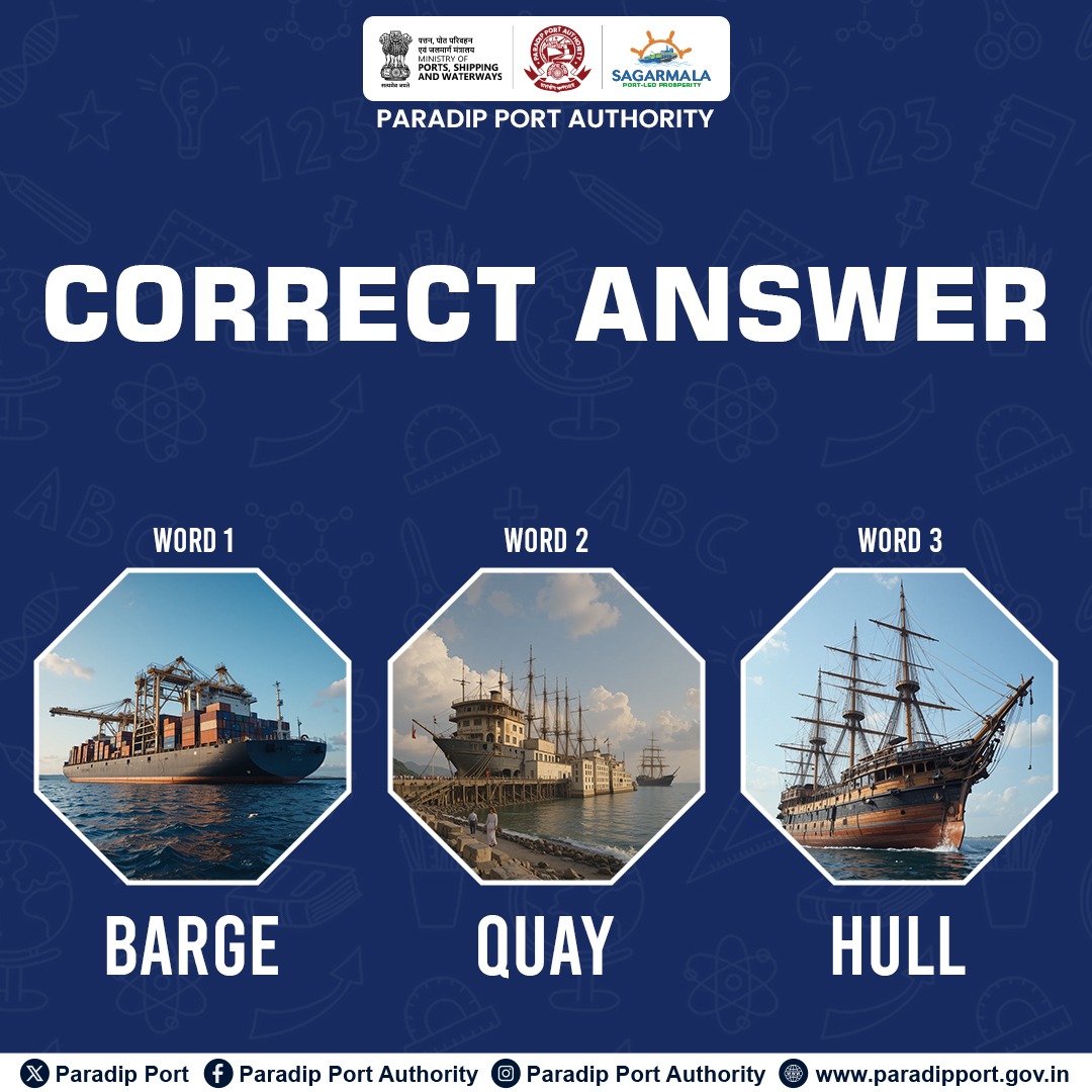 CORRECT ANSWERS ARE IN ✅ Well done to everyone who took part in our maritime word challenge. 🔹 Word 1: BARGE 🔹 Word 2: QUAY 🔹 Word 3: HULL Keep testing your port and shipping knowledge with more engaging activities from Paradip Port Authority. #CorrectAnswer