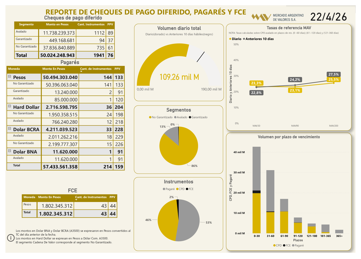 📲Informe diario 22/04/26 #CPD (Físicos e Echeqs) Total: $50.024.248.943 #Pagarés Total: $57.433.561.358 #FCE Total: $1.802.345.312