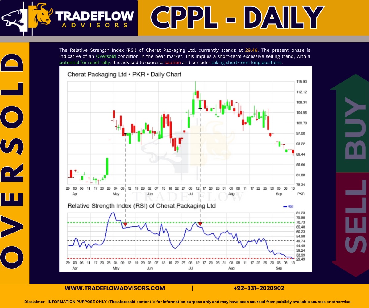 #CPPL-The Relative Strength Index (RSI) of Cherat Packaging Ltd. currently stands at 29.49. The present phase is indicative of an Oversold condition in the bear market. This implies a short-term excessive selling trend, with a potential for relief rally. It is advised to exercise