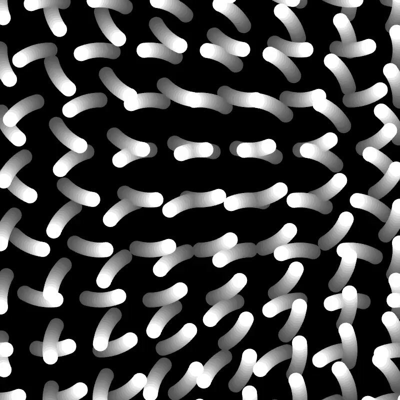 f=0,draw=r=>{for(f||createCanvas(W=400,W),noStroke(background(0,22)),j=-600;j<600;j+=50)for(i=-W;i<430;i+=50)y=50*cos(F=f+j+i),circle(x=50*sin(F)+200-i,y+200-j,15),circle(300-x,50-y+100-j,15);f+=.05};//#つぶやきProcessing #tinycode #creativecode #p5js #sin #cos #algoart