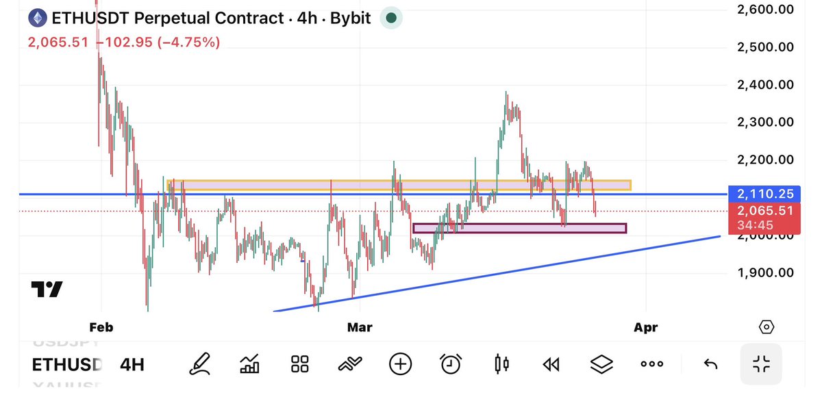 $ETH price has failed to hold the $2,200 resistance level. If price breaks below the $2,000 support level, it might likely retrace down to the $1,937 trendline before any further momentum takes place. #crypto #CryptoWorld #eth
