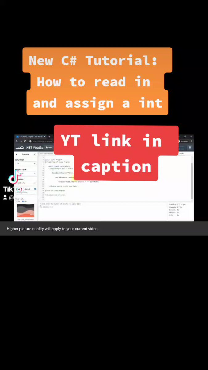 Hot off the press C# Tutorial posted to my yt: How to read in and assign a int youtu.be/vmeD_AGLB3Y #csharpdeveloper #csharpprogrammer #csharpcoder #learntocode #codingschool #csharp #csharptutorials #int