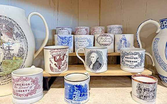 At the Elverson Antique Show: Kurau’s Antiques brought an assortment of children’s transferware cups ranging from $350 to $950. Some feature sayings like “America Land of Liberty,” “Forget Me Not,” and “Prosper Freedom.” maineantiquedigest.com/stories/redwar… #antiques #antique #cups #history