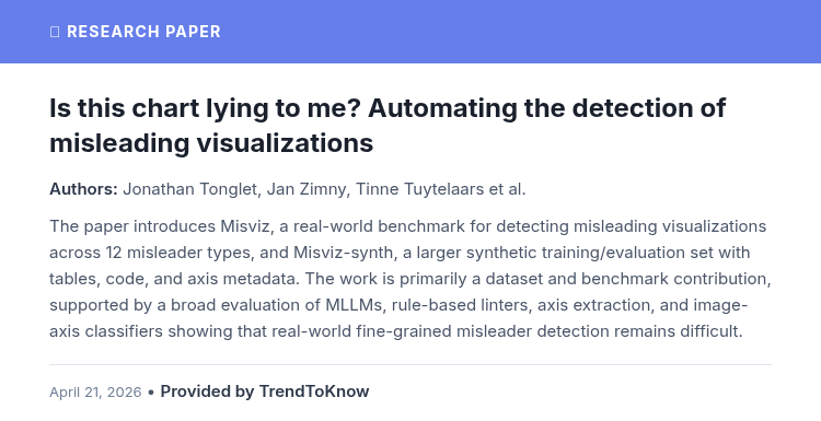 Is this chart lying to me? Automating the detection of misleading visualizations 👥 Jonathan Tonglet, Jan Zimny, Tinne Tuytelaars & Iryna Gurevych #AIResearch #MachineLearning #DataVisualization #ComputerVision 🔗 trendtoknow.ai/paper-reviews/…