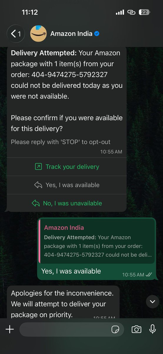 @AmazonHelp My order was supposed to be delivered on 24 April. The delivery agent called and said it would be delivered tomorrow, which I agreed to. Now I received a message saying I was unavailable, even though I was available. Please look into this. @amazonIN #delivery