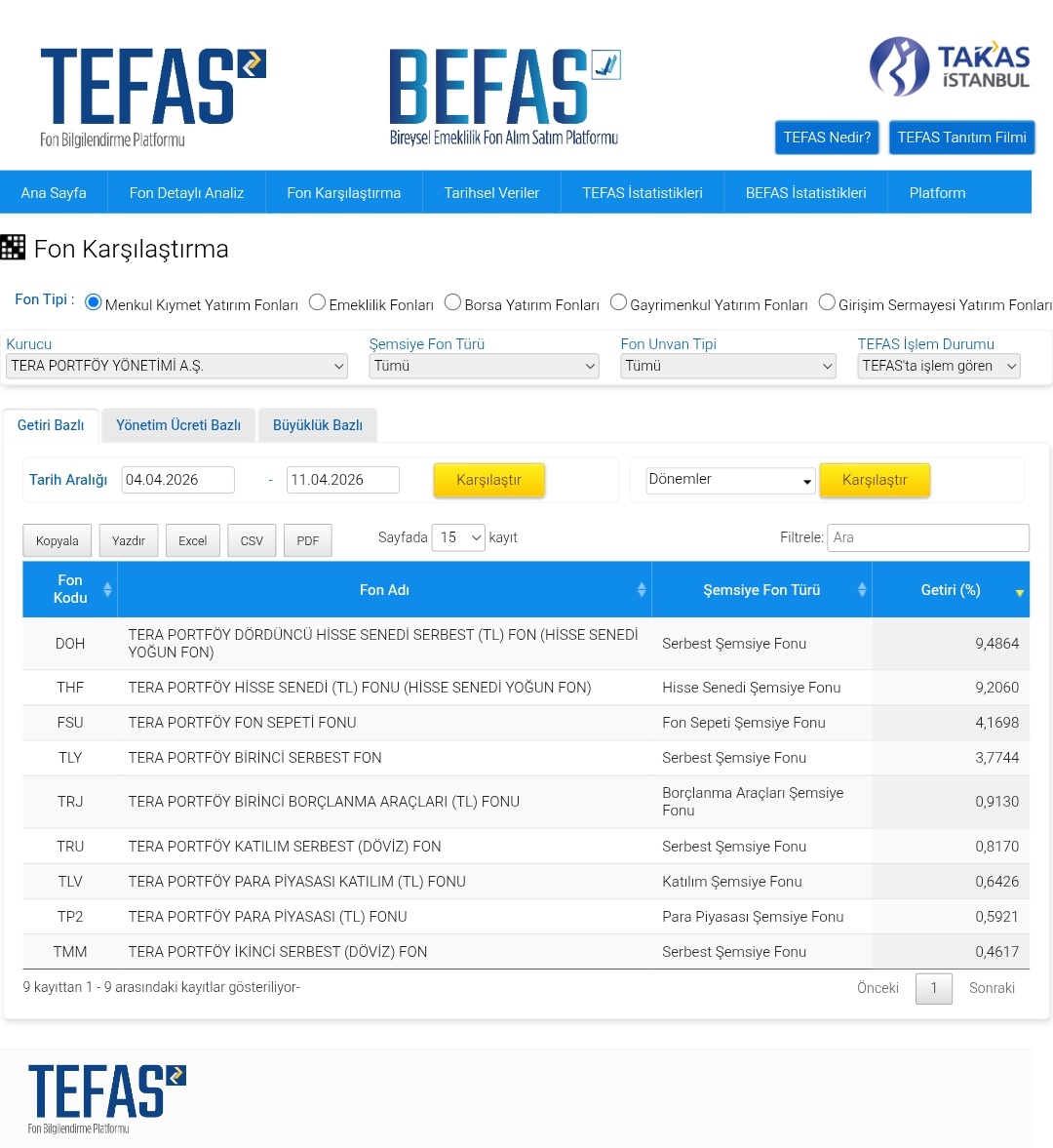 Tera Portföy Fonlarının Günlük Getirileri #T3B #DOH #THF #FSU #TLY #TMV #TMM #TRU #TP2 #TRJ #TLV #MLK