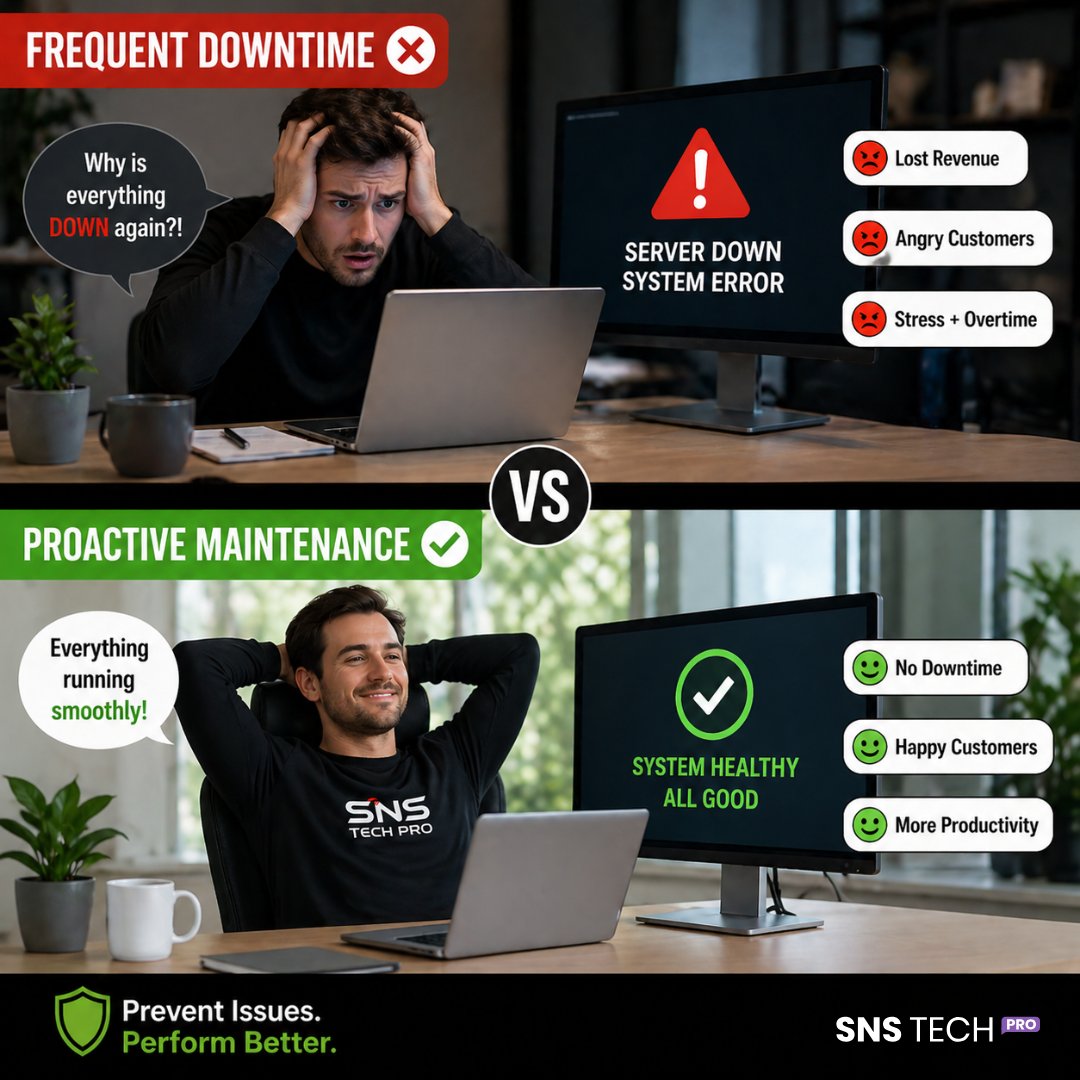 Frequent downtime isn’t just annoying - it’s 𝐞𝐱𝐩𝐞𝐧𝐬𝐢𝐯𝐞. • Lost revenue • Angry customers • Burnt-out teams Proactive maintenance flips the game. Prevent issues before they happen. Visit: snstechpro.com #ITSupport #Downtime #ProactiveIT #BusinessGrowth