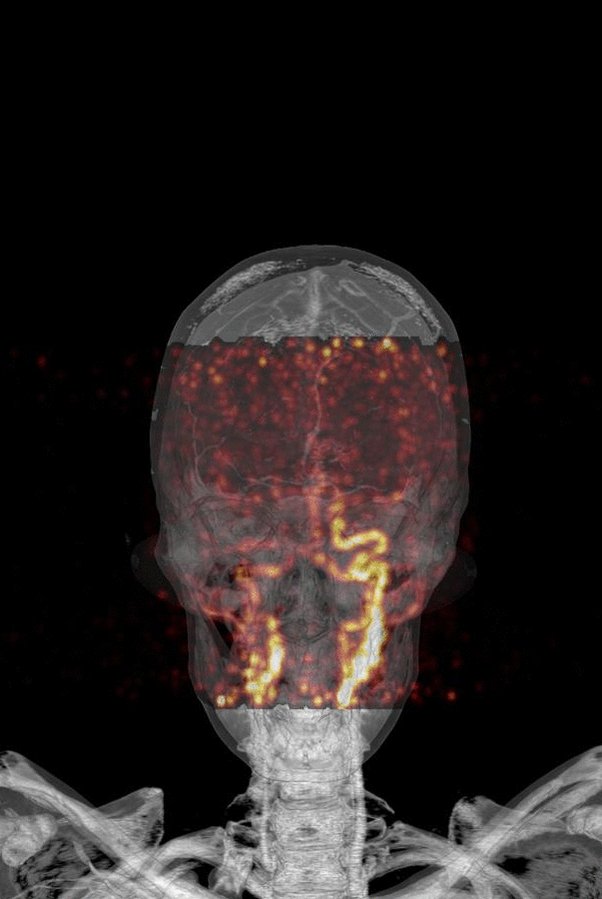 32yr old patient with stenosis of the right arteria carotis interna - PET for exclusion of large vessel vasculitis. We did a dynamic (list mode) PET to visualize the vessels. (1/2) #dynamicPET #MolecularImaging #radiology #FOAMrad #radres