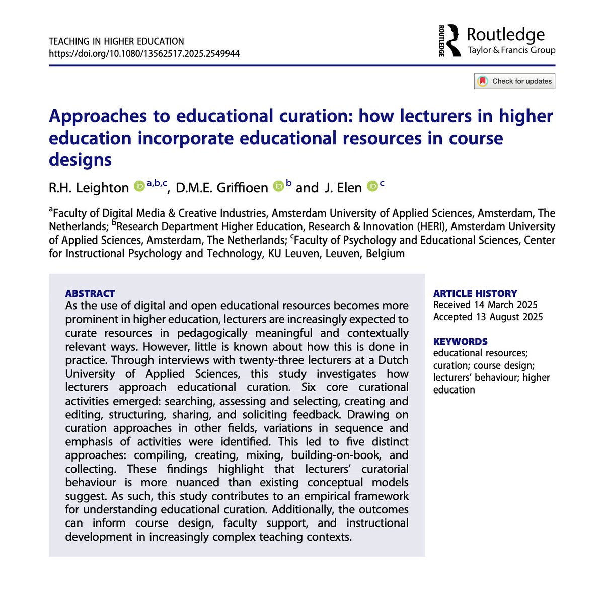 New publication alert! 🚨 Approaches to educational curation: how lecturers in higher education incorporate educational resources in course designs By R.H. Leighton et al. tandfonline.com/doi/full/10.10… #HigherEd #EducationalResources