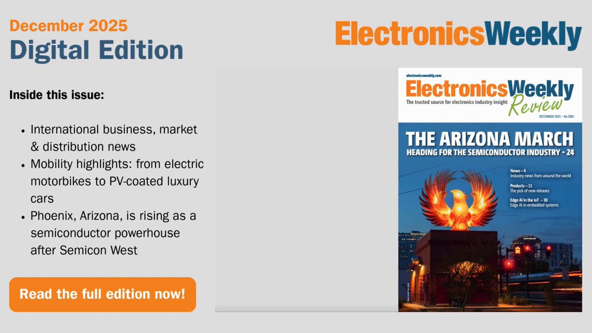 The Dec 2025 #ElectronicsWeekly digital edition is here! 🌐 💡 Global news, market & mobility updates 🚗 EVs to PV-coated luxury cars 🔥 Cover: Phoenix, AZ rises as a #semiconductor hub after Semicon West Read now: ow.ly/78Tt50Xy0p8
