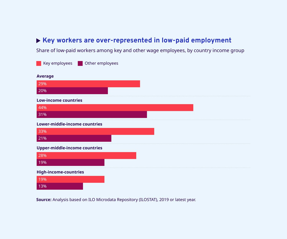 How key workers are valued is reflected in their pay and working conditions. On average, 𝟮𝟵% of key employees have low salaries. In low-income countries, that number rises to 𝟰𝟰%. It's time to revalue #EssentialWork. Digital guide ➡️ bit.ly/3n6NXoO