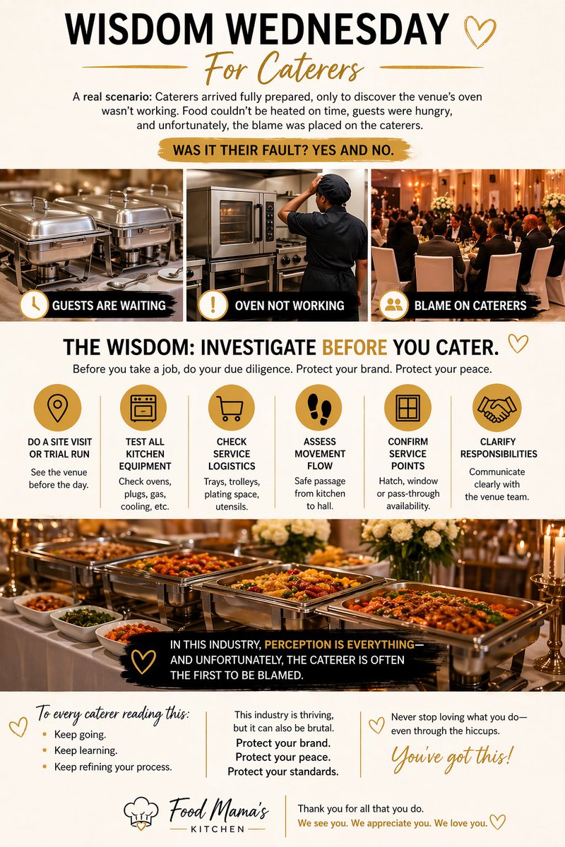 Caterers, protect your reputation. Always check the venue BEFORE the event—test equipment, confirm logistics, and never assume anything works. Delays aren’t always your fault… but they’ll blame you first. Stay sharp. Stay ready. 💛 #WisdomWednesday #CaterersLife #EventProfs