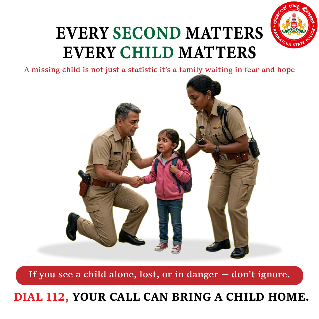 Every moment matters when a child goes missing. Be aware. Be responsive. If you spot a child alone, lost, or at risk — take action immediately. 📞 Dial 112 in case of emergency. #EverySecondCounts #EveryChildMatters #KarnatakaPolice #ChildSafety #Dial112