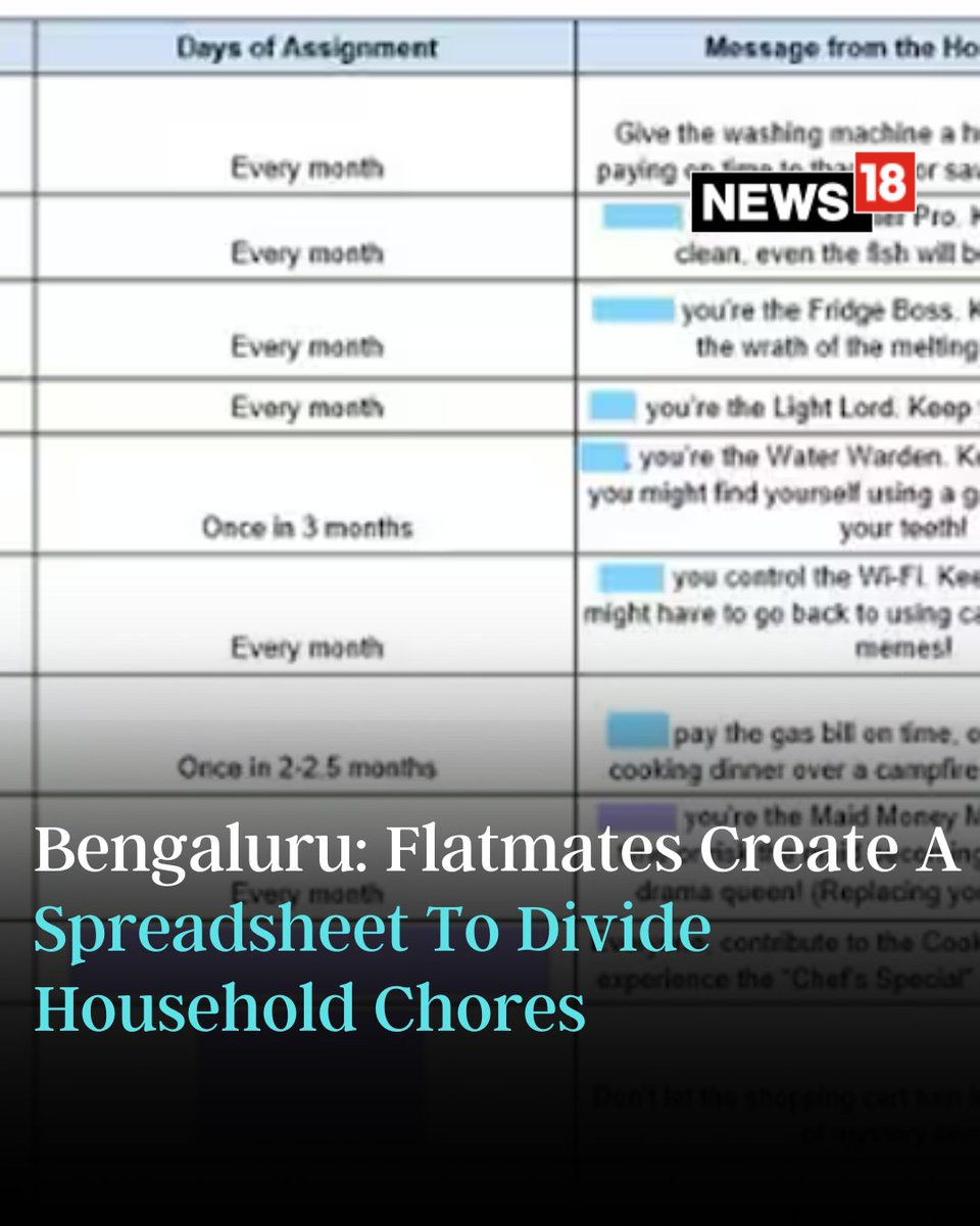 In another Peak Bengaluru moment, a woman shared an X (formerly Twitter) post showcasing how flatmates in the city handle the daily responsibilities of the house #Roommates #HouseholdChores #ExcelSpreadSheet #Viral #Bengaluru #Trending #FunnyPost news18.com/viral/flatmate…
