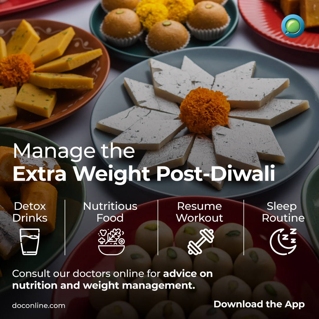 Manage your weight and make DocOnline a part of your Detox journey post Diwali. Mail us at [email protected] to get in touch with our experts or download our app now to book your appointment. #PostDiwali #ExtraWeight #WeightManagement #Diet #DocOnline