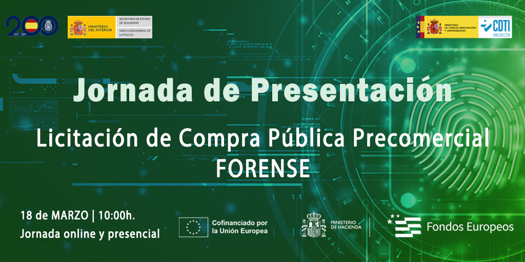 📢Jornada de presentación de la Licitación de #CompraPúblicaPrecomercial #FORENSE para el desarrollo de un sistema innovador de #InteligenciaForense ✅ Se presentarán el pliego administrativo y los dos lotes técnicos licitados 🤝@CDTI_innovacion y la Secretaría de Estado de