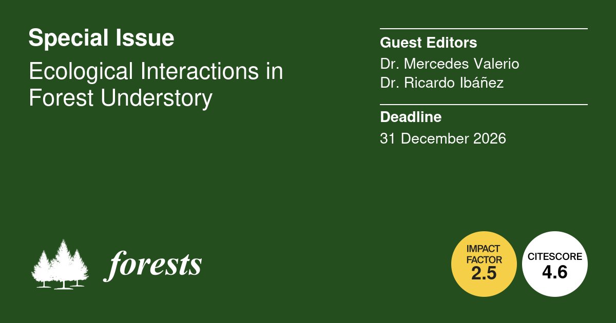 New special issue in #Forests "Ecological Interactions in Forest Understory" is now accepting manuscript submissions! Edited by Dr. Mercedes Valerio and Dr. Ricardo Ibáñez 🔗 Submit your work here: mdpi.com/journal/forest… 📆 Deadline for manuscript submissions: 31 December 2026