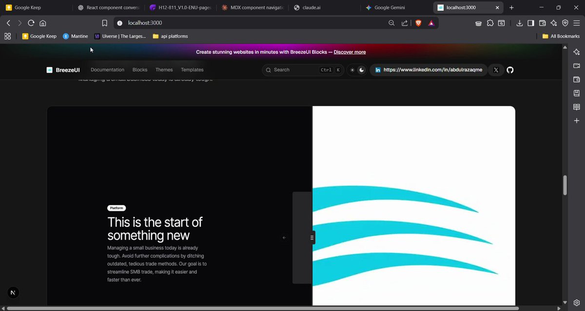 🧵 Day 3 of building Breeze UI: Progress update! 1/ Today I focused on making the homepage more solid and visually appealing. Added some beautiful sections that really make the layout pop. 🌟 #BreezeUI #WebDev #OpenSource #Frontend