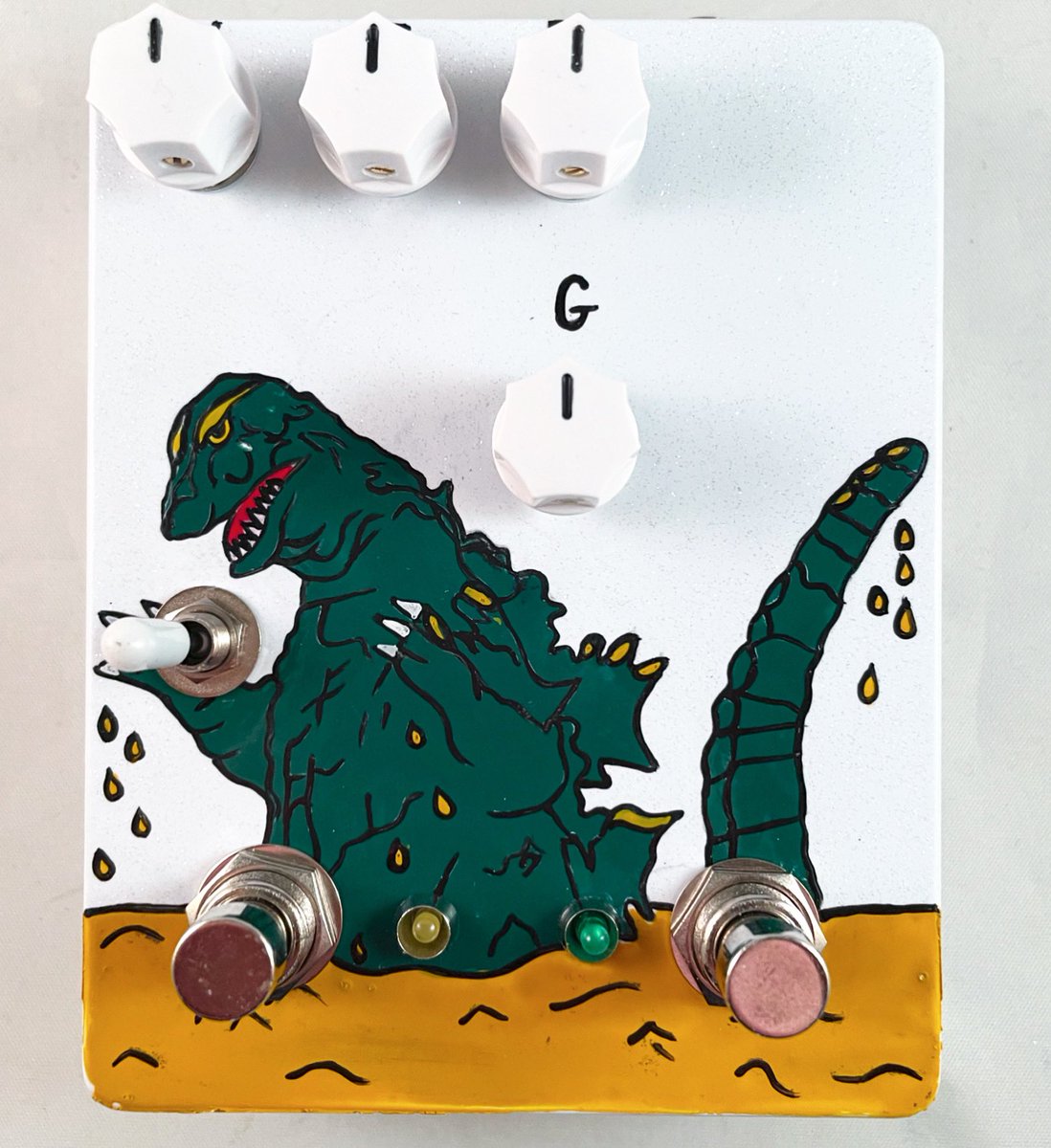 Customer-commissioned Godzilla art. Li’l Fella overdrive/distortion + analog monophonic octave up. Would you run from Godzilla or give his chubby tail a hug? #fuzzrocious #fuzzrociouspedals #stompboxes #effectspedals #effectpedal #effectpedals #godzilla #gojira #kaiju
