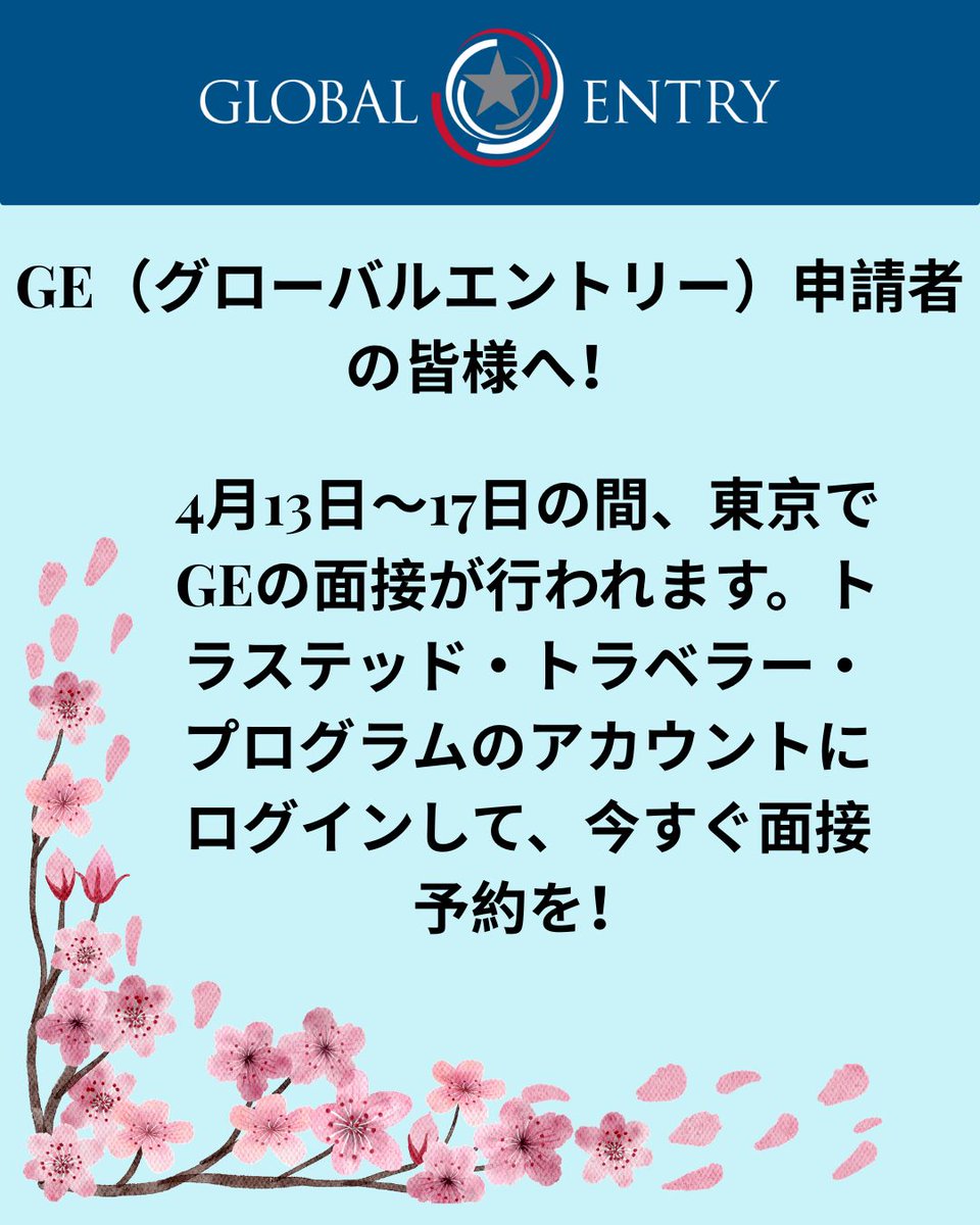 グローバルエントリーに申請し仮承認を受けたものの、まだ面接予約をされていない方へ朗報です!米国税関・国境取締局の担当官が、4月13日~17日に東京で面接を実施します。この機会をお見逃しなく!今すぐTTPアカウントにログインして、面接を予約しましょう。ttp.dhs.gov #GlobalEntry