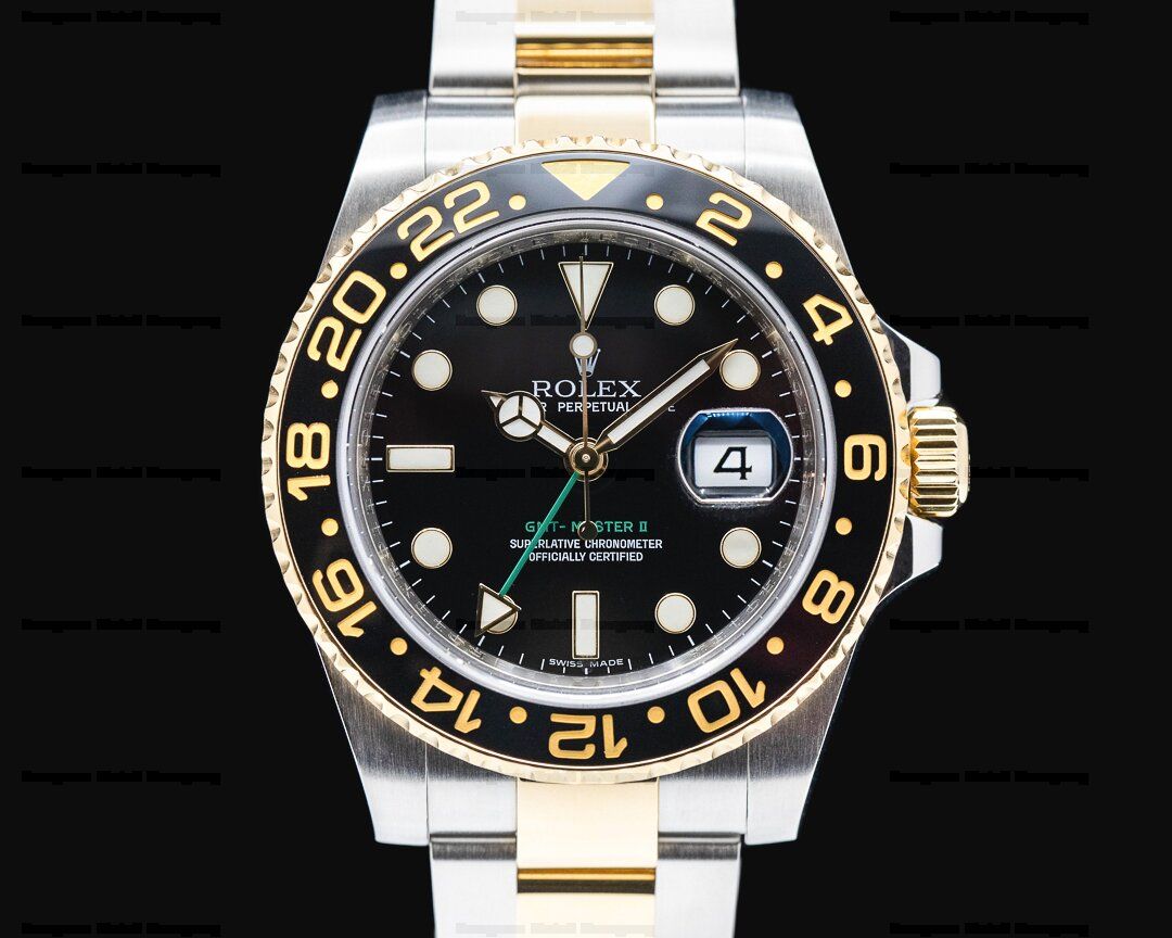 Rolex GMT Master II 116713LN SS / 18K Yellow Gold Black Dial. bit.ly/3PUwewW #Rolex #GMTMasterII #Horology #Rolex116713LN