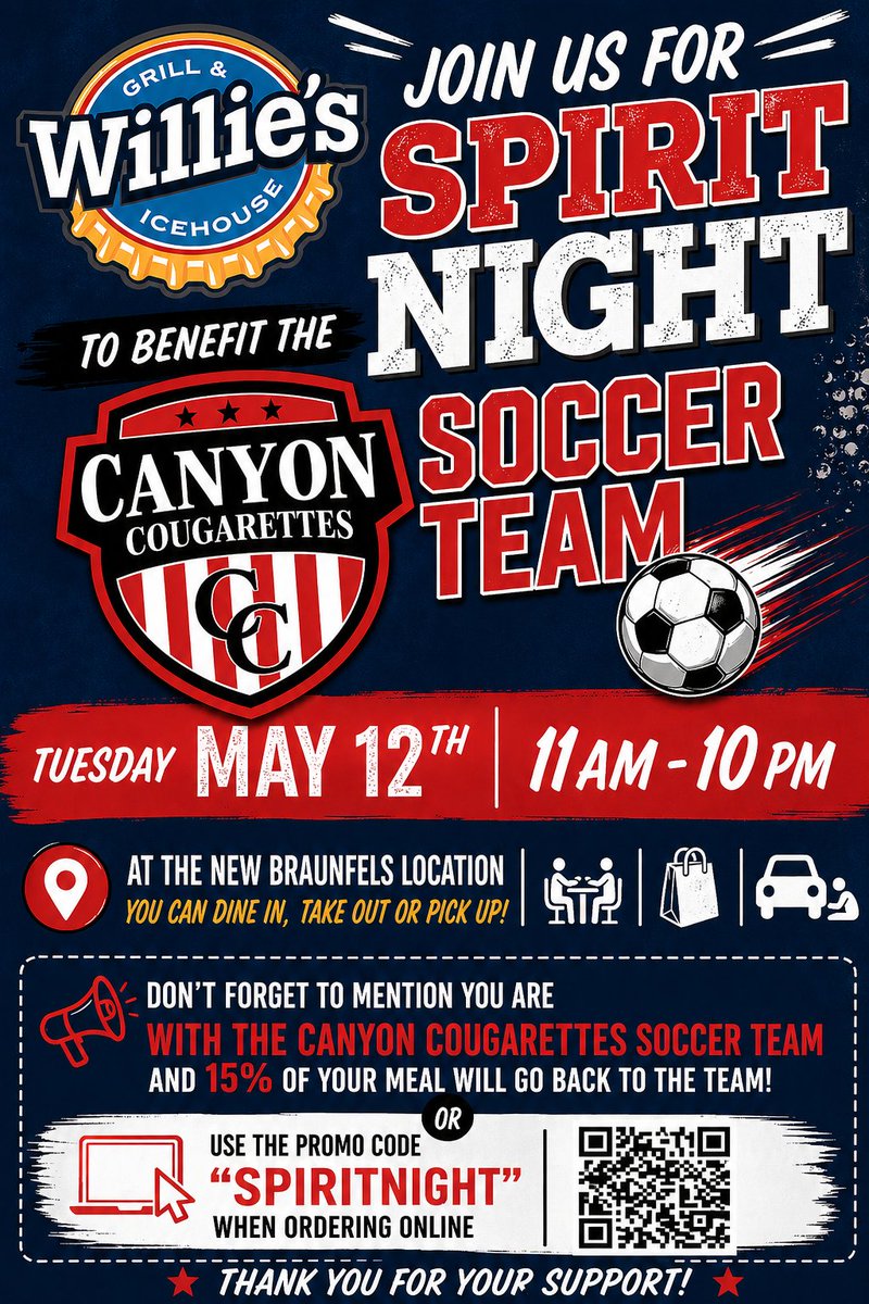 May is BUSY; practices, games, work, etc. Take a break & treat yourself right! Dine In, Carry Out, or Order Online. Treat yourself & the family & join us at Willie’s on May 12. @cisdnews @CanyonMiddle #GOCOOGS #CWC #SpritNight #SupportLocal