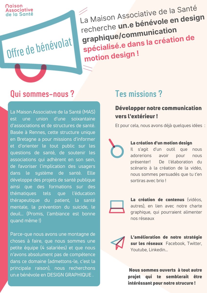 APPEL A BENEVOLE: CREATION MOTION DESIGN La Maison Associative de la Santé recherche un.e #bénévole en #design #graphique ou #communication pour la création d'un motion design ! N'hésitez pas à diffuser l'annonce dans vos réseaux ! #recherche #bénévolat #motiondesign