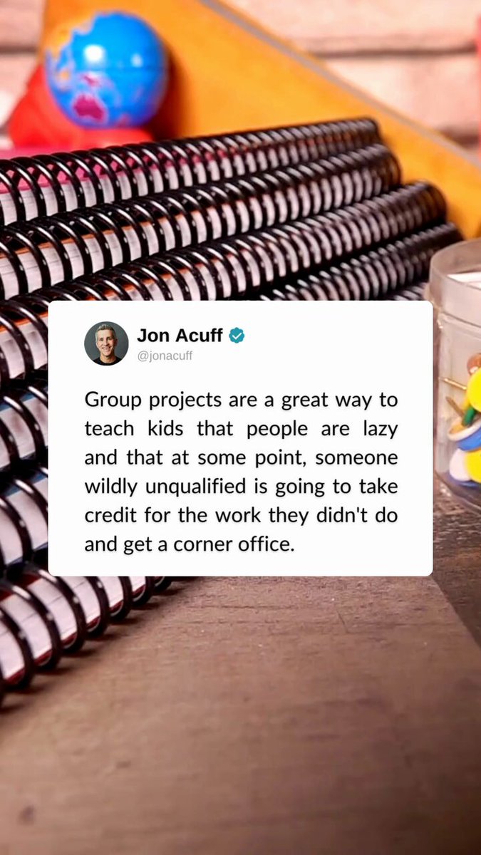 "Just realized that group projects are like a crash course in life: you learn how to work with people, how to do everything yourself, and most importantly, how much you hate people! 😅🤦♂️ Who else can relate? #GroupProjects #LifeLessons" Who can share his /her experiences on this