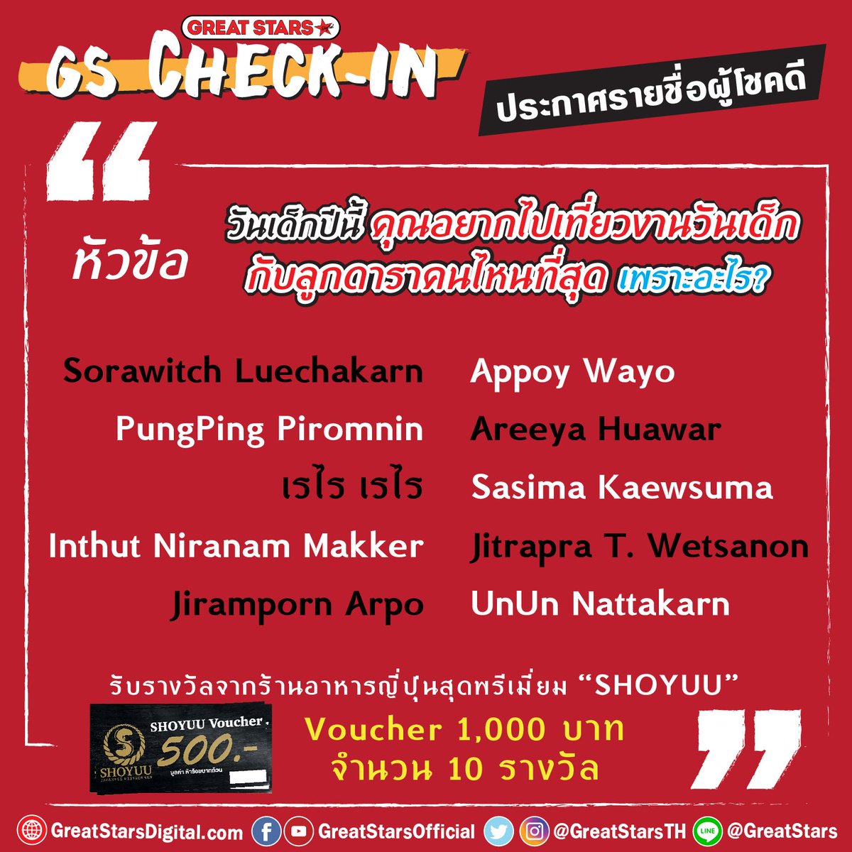 รายชื่อผู้โชคดีจากการ ร่วมสนุกในกิจกรรม " วันเด็กปีนี้ คุณอยากไปเที่ยวงานวันเด็กกับลูกดาราคนไหนที่สุด เพราะอะไร?" ผู้โชคดีติดต่อรับของรางวัลโดยแจ้งชื่อที่อยู่และเบอร์ติดต่อกลับทาง FB : GreatStarsOfficial #GreatStars #GreatStarsบันเทิง #GSCheckin #ร้านอาหารญี่ปุ่น #SHOYUU