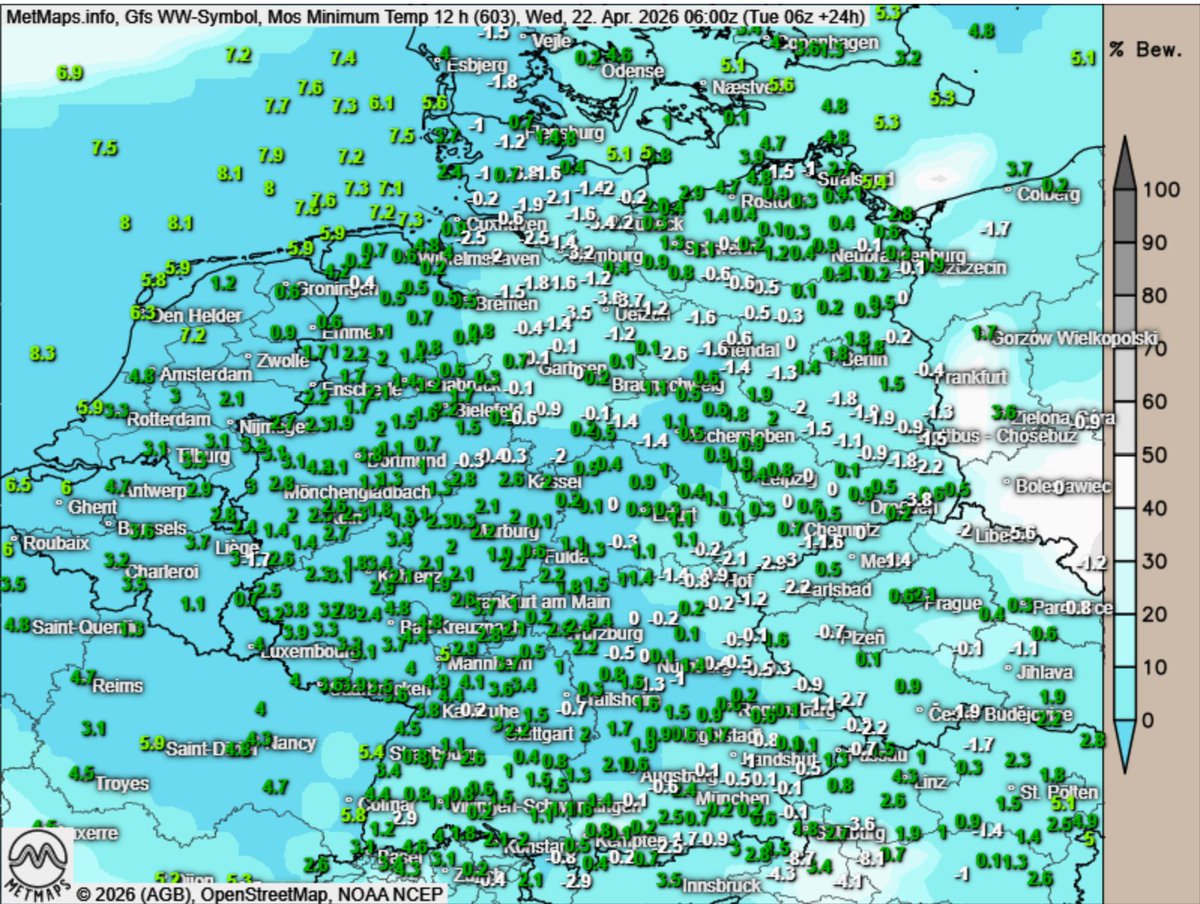 ACHTUNG ACHTUNG ACHTUNG -----> nachts nochmals Frost und Bodenfrost Hier die Tiefstwerte morgen früh nach GFS und MOS. Besonders von SH über #Hamburg, Sachsen-Anhalt, #Berlin bis Sachsen kalt. Teilweise bis zu -4 Grad C Lufttemperatur. (c) donnerwetter.de