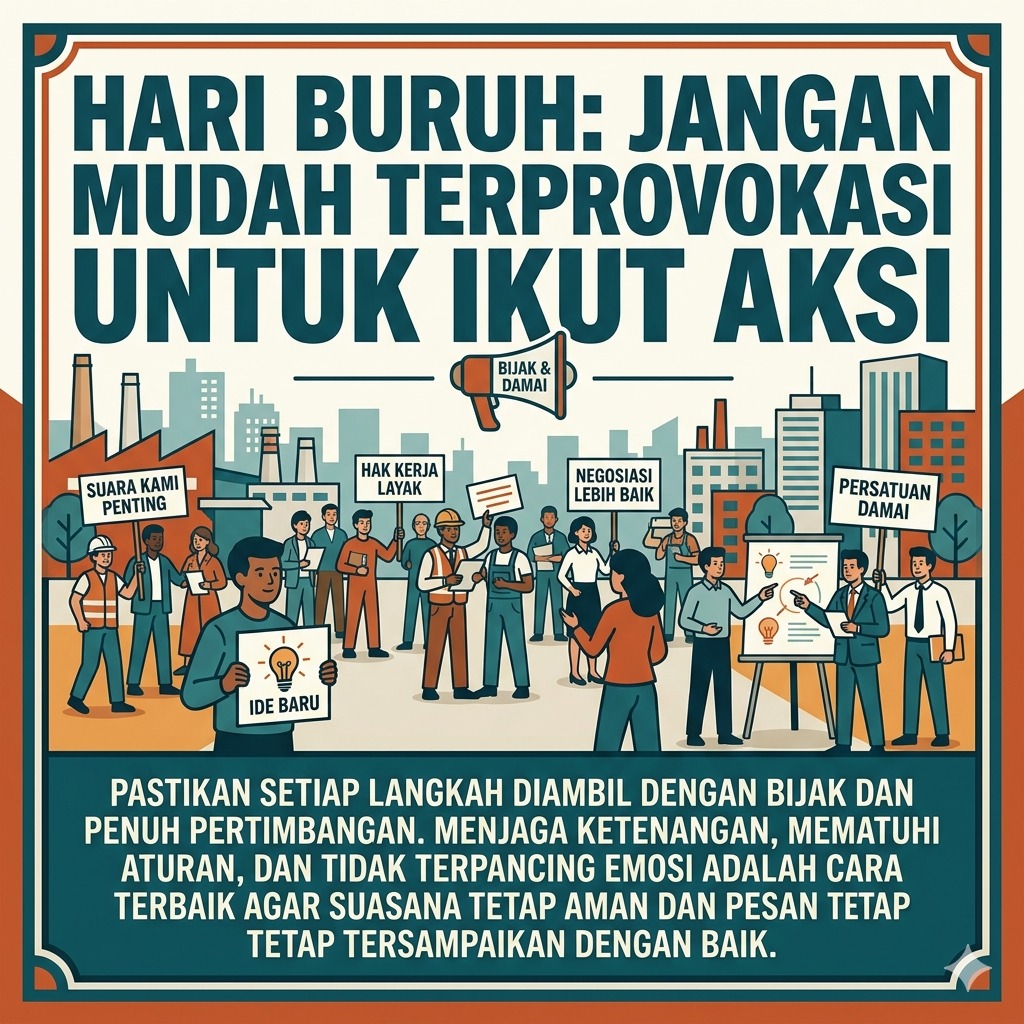 Hari Buruh: Tetap Bijak, Jangan Mudah Terprovokasi! Sampaikan aspirasi dengan aman, tertib, dan sesuai aturan agar pesan didengar tanpa merugikan siapa pun. #HariBuruh #BijakBertindak #AspirasiTertib #Damai