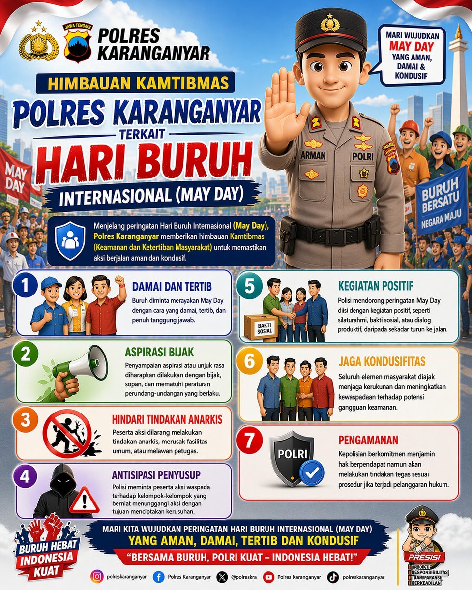 Dalam rangka memperingati Hari Buruh Internasional (May Day), Polres Karanganyar mengajak seluruh elemen masyarakat untuk bersama-sama menjaga situasi yang aman, damai, tertib, dan kondusif 🤝 #PolresKaranganyar #MayDay2026 #HariBuruh #Kamtibmas #PolriPresisi #AmanDamaiTertib