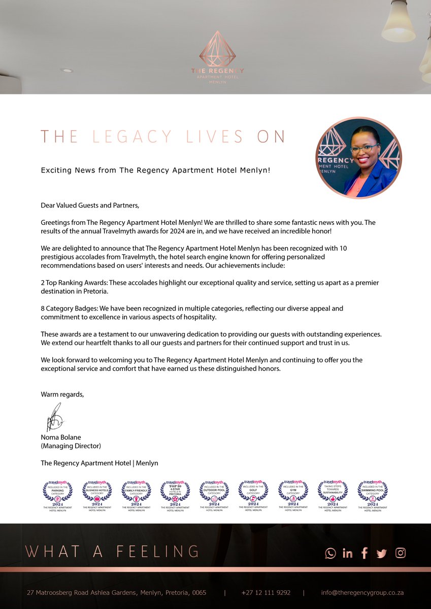 🌟 Exciting News! 🌟 We're thrilled to be recognized in the 2024 Travelmyth Awards! 🎉 - Noma Bolane Managing Director of The Regency Apartment Hotel | Menlyn #TravelmythAwards2024 #TheRegencyMenlyn #HotelAwards #LuxuryTravel #GuestExperience #ProudMoment