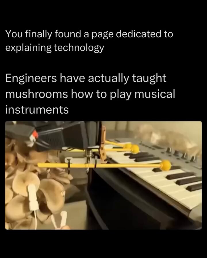Manchester engineers turned real mushrooms into a live orchestra 🍄📷 Tiny sensors on the caps catch natural bio-electric pulses → converted LIVE into MIDI → robotic arms play drums, violins, xylophones. Not sci-fi. Actual fungi making music. #BioTech #HowTechWorks
