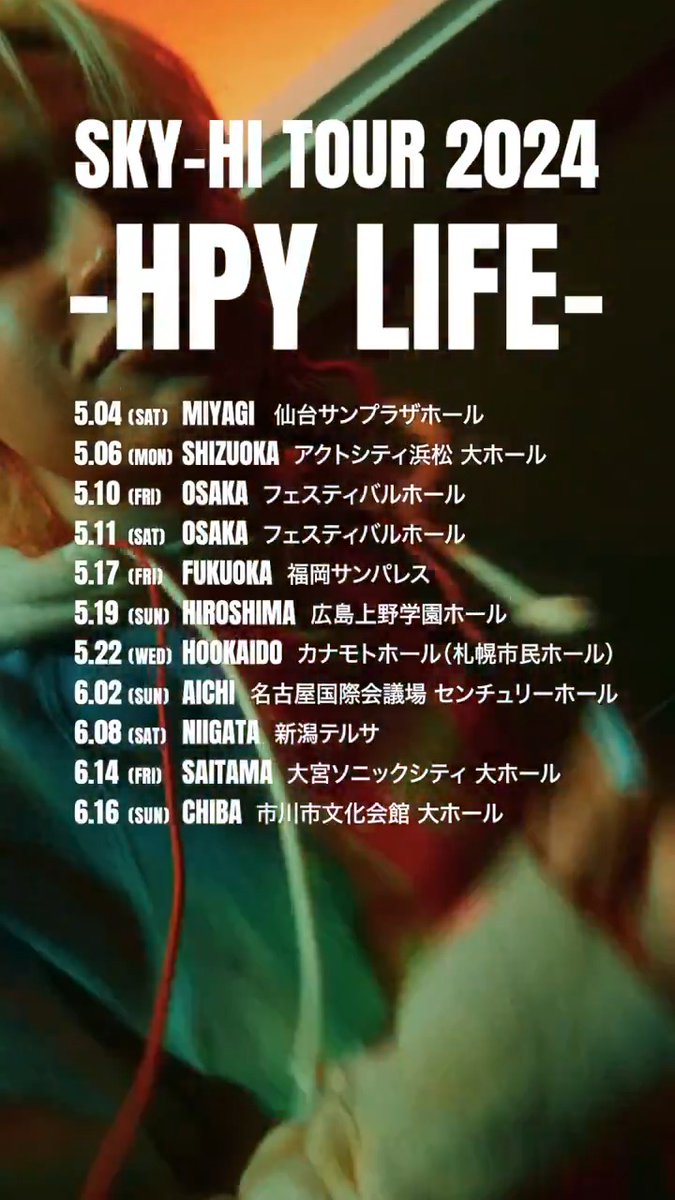 SKY-HI TOUR 2024 -HPY LIFE- 明日4/20(土)AM10:00 一般発売スタート! mu-mo TICKET r.y-tickets.jp/skyhi2401 ぴあ w.pia.jp/t/skyhi/ ローチケ l-tike.com/sky-hi/ e+ eplus.jp/sky-hi/ ツアースケジュールはALTを☑︎ #TOUR2024_HPYLIFE #HPY #SKYHI
