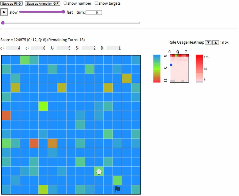 #AHC056 #HTTF 暫定12位でした。 全体的には、配置パターン決め→ルート探索→命令の決定・詰め込みの流れで、色0と1を固定マスとして配置し、残りのマスで制御することで命令数の節約を図りました。