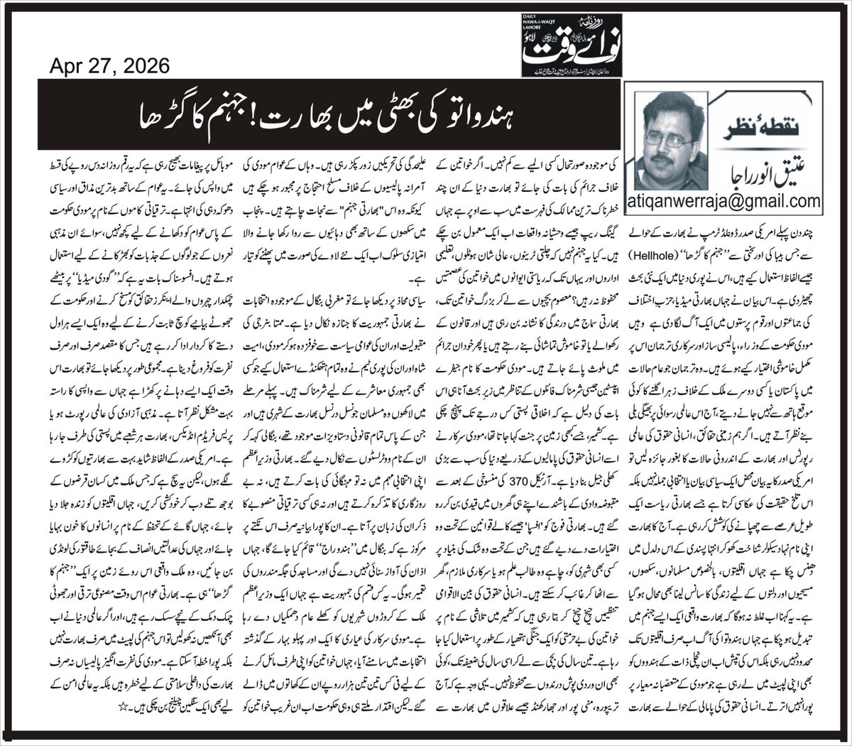 مودی حکومت کی انتہا پسندانہ پالیسیوں اور امریکی صدر کے حالیہ بیان کی روشنی میں بھارتی ریاست کا ایک پوسٹ مارٹم۔ کیا بھارت واقعی "جہنم کے گڑھے" میں تبدیل ہو چکا ہے؟ nawaiwaqt.com.pk/27-Apr-2026/19… #HindutvaExtremism #HumanRightsViolations #KashmirCrisis #Hellhole #RegionalSecurity