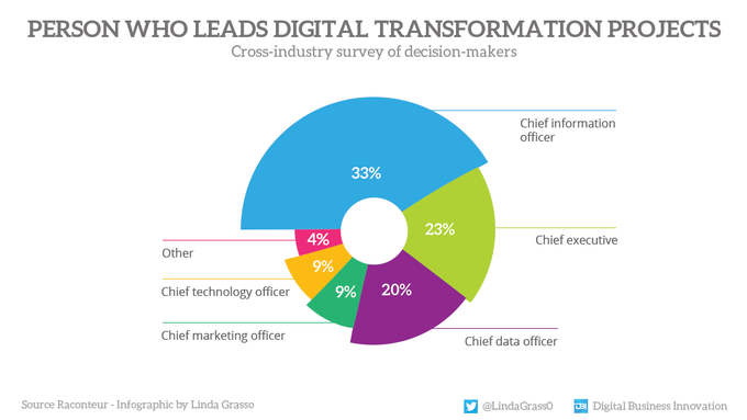 Who leads Digital Transformation projects? CIO is the most quoted person, as per a cross-industry survey of decision-makers, followed by CEO and CDO. Data >> @raconteur °°° #Infographic by @LindaGrass0 & @antgrasso #DigitalTransformation #CIO #CEO #CDO #Innovation #4IR