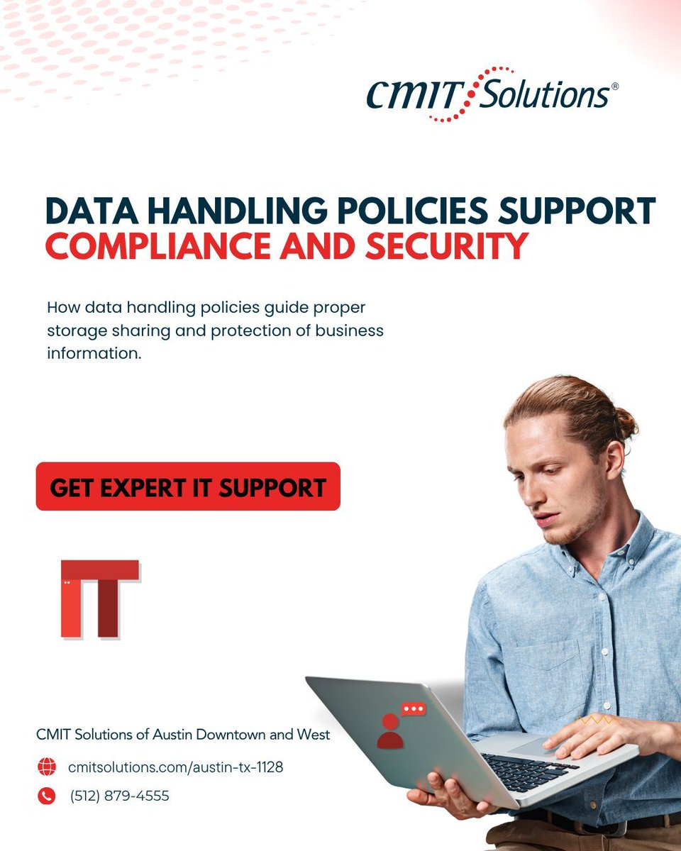 Data handling policies define how information is stored shared and protected. Clear guidelines support compliance requirements and reduce data exposure risks. Visit cmitsolutions.com/austin-tx-1128/ or call (512) 879-4555 #DataHandlingPolicy #AustinBusinessCompliance #InformationSecurity