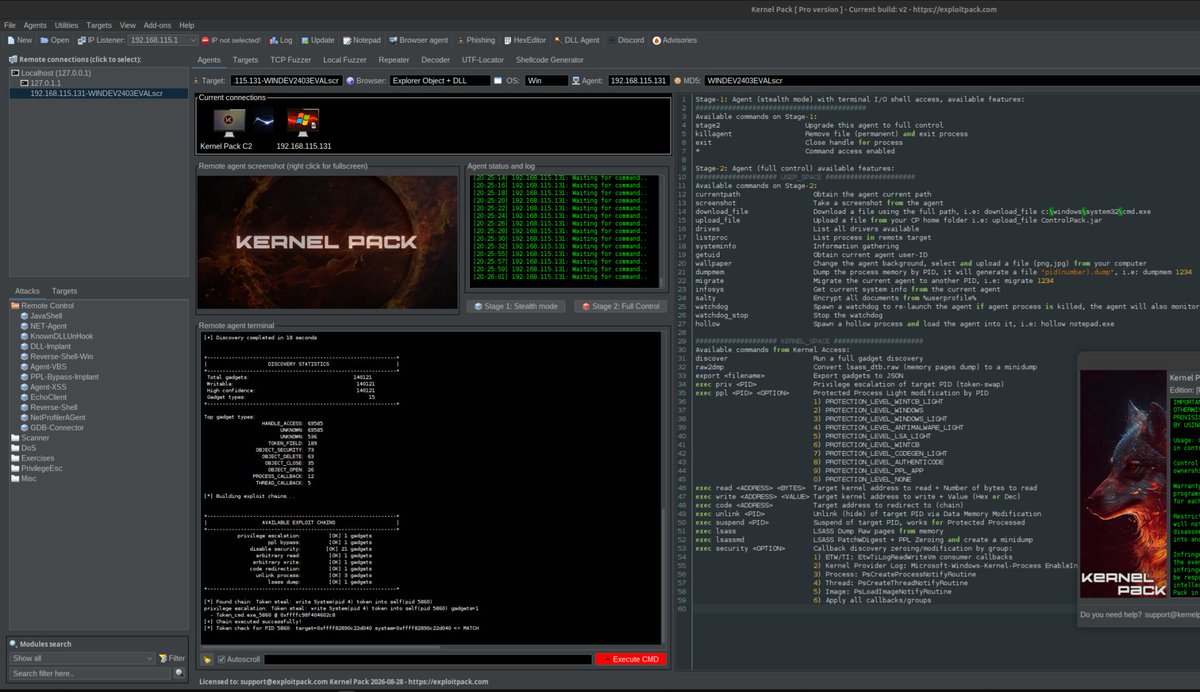 New version of Kernel Pack, the only C2 framework on the market for cybersec professionals, with Kernel-level access. exploitpack.com/products/kerne… Bypasses VBS/HVCI/kCET, even with EDR/AV solutions enabled. #Kernel #RedTeam #InfoSec #CyberSecurity #Pentest #offsec #defender #VBS