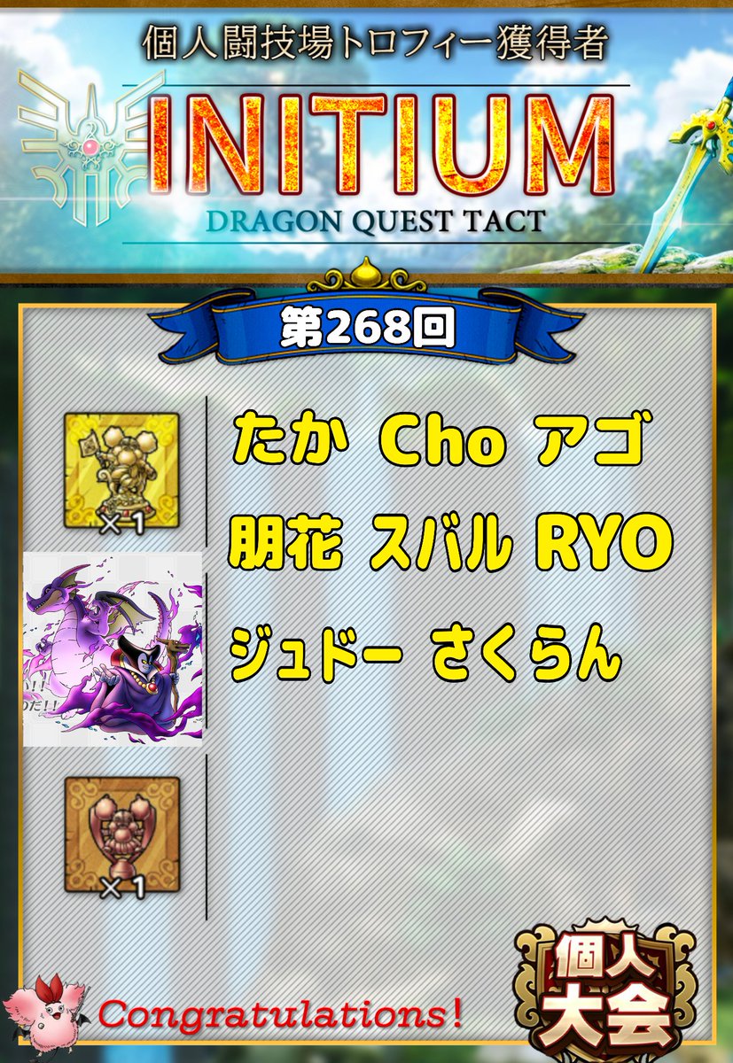 ⚔️第266・267回個人闘技場⚔️ “INITIUM”では、以下のメンバーが金トロ🏆を獲得しました😊✨ 🏆GETした皆さん、おめでとうございます🎉 また、第4回グランドトーナメントでは16名がGC優勝🥳🎊 超魔王2体がしっかり強いのは盛り上がって良いですね🎶 #INITIUM #個人闘技場 #グランドトーナメント