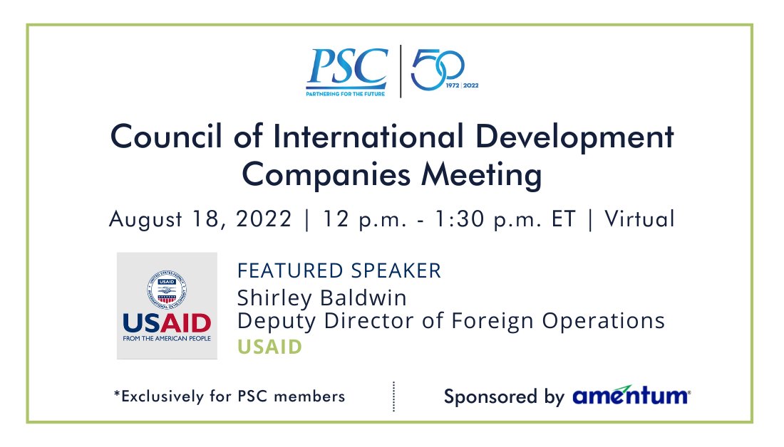 PSCSpeaks: [Tomorrow] Join PSC for a Council of International Development Companies Meeting virtually on August 18. Hear from USAID’s Dep. Director of Foreign Operations. @USAID @amentum_corp Register here: pscouncil.org/Shared_Content… #internationaldevelop…