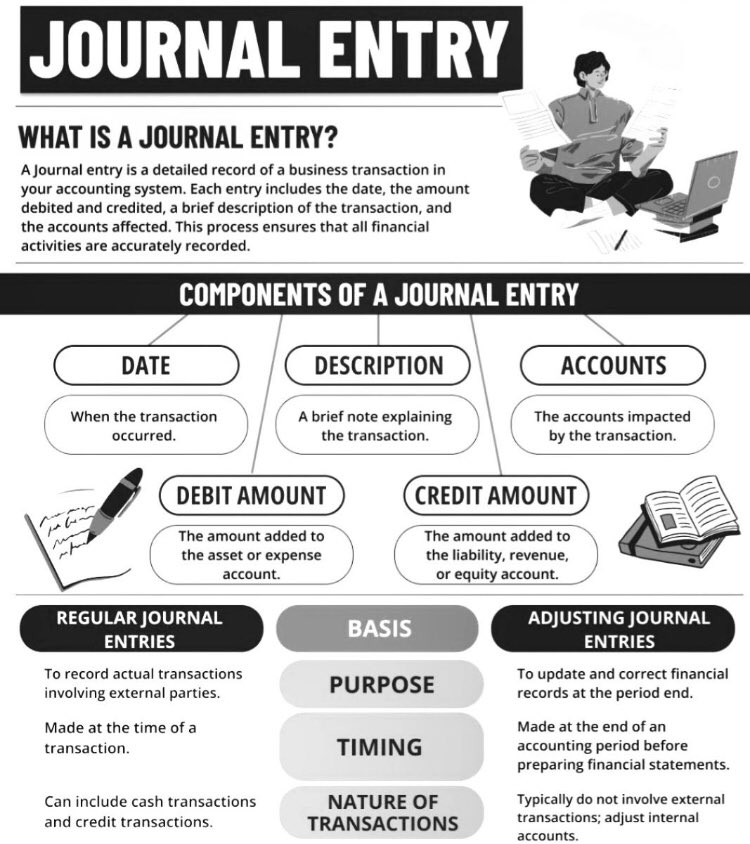 A journal entry in accounting is a record of financial transactions that captures the details of each transaction, including date, accounts affected, and amounts. #AccountingBasics #JournalEntry #FinancialLiteracy #JournalEntries velan-bookkeeping.com/blog/journal-e…