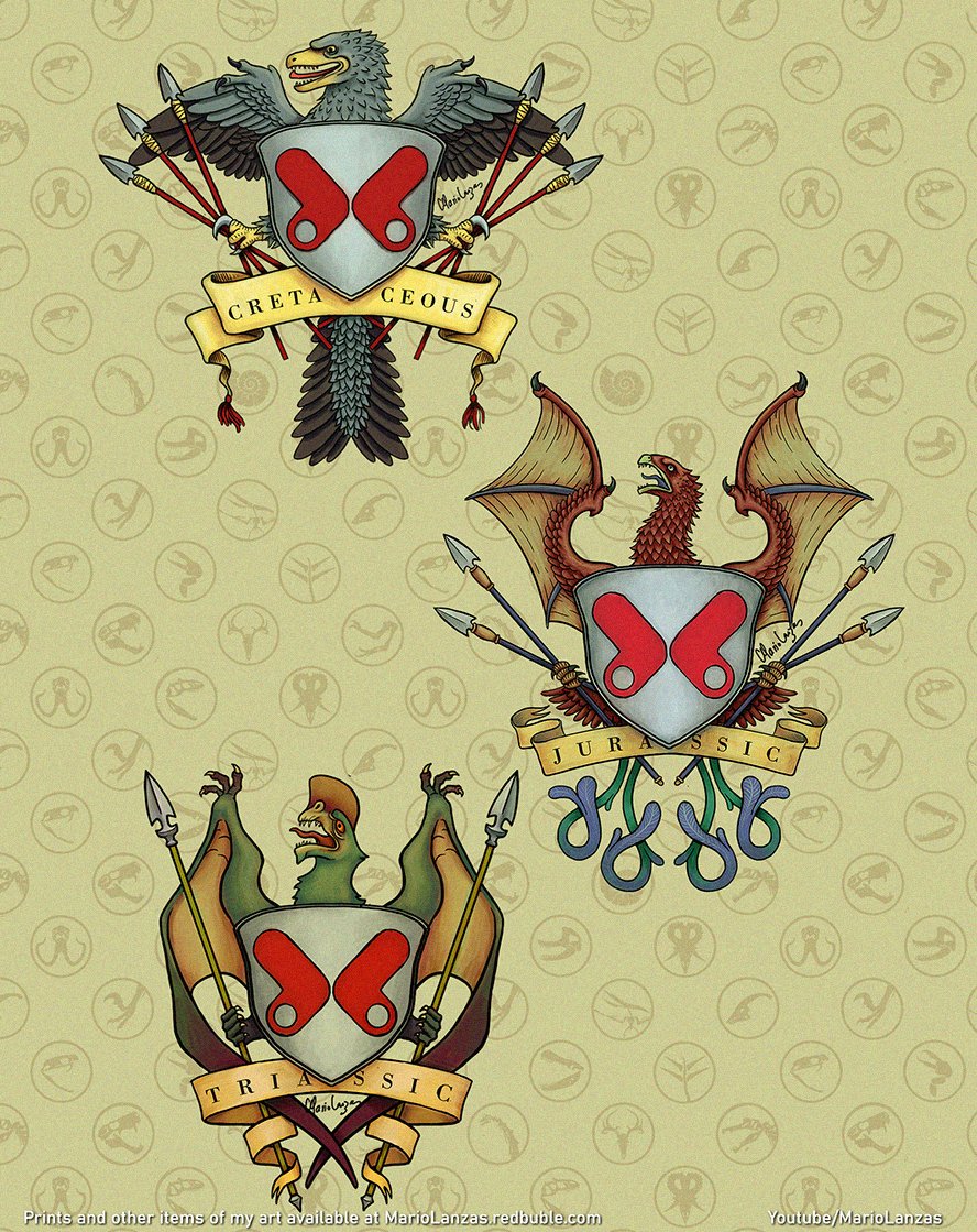 Coats of arms of each map I made so far of different or geologial periods: #Permian, #Triassic, #Jurassic, #Cretaceous and #Paleogene 🛡️ Can you guess which animal is represented on each one? 👀 #heraldry #medievalart #paleontology #prehistoricanimals #naturalhistory #dinosaurs