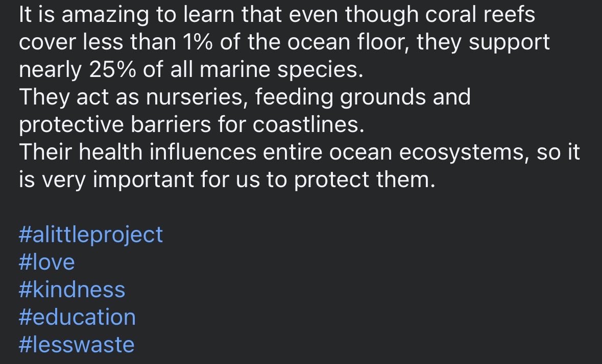 It is amazing to learn that even though coral reefs cover less than 1% of the ocean floor, they support nearly 25% of all marine species. #alittleproject #love #kindness #education #lesswaste