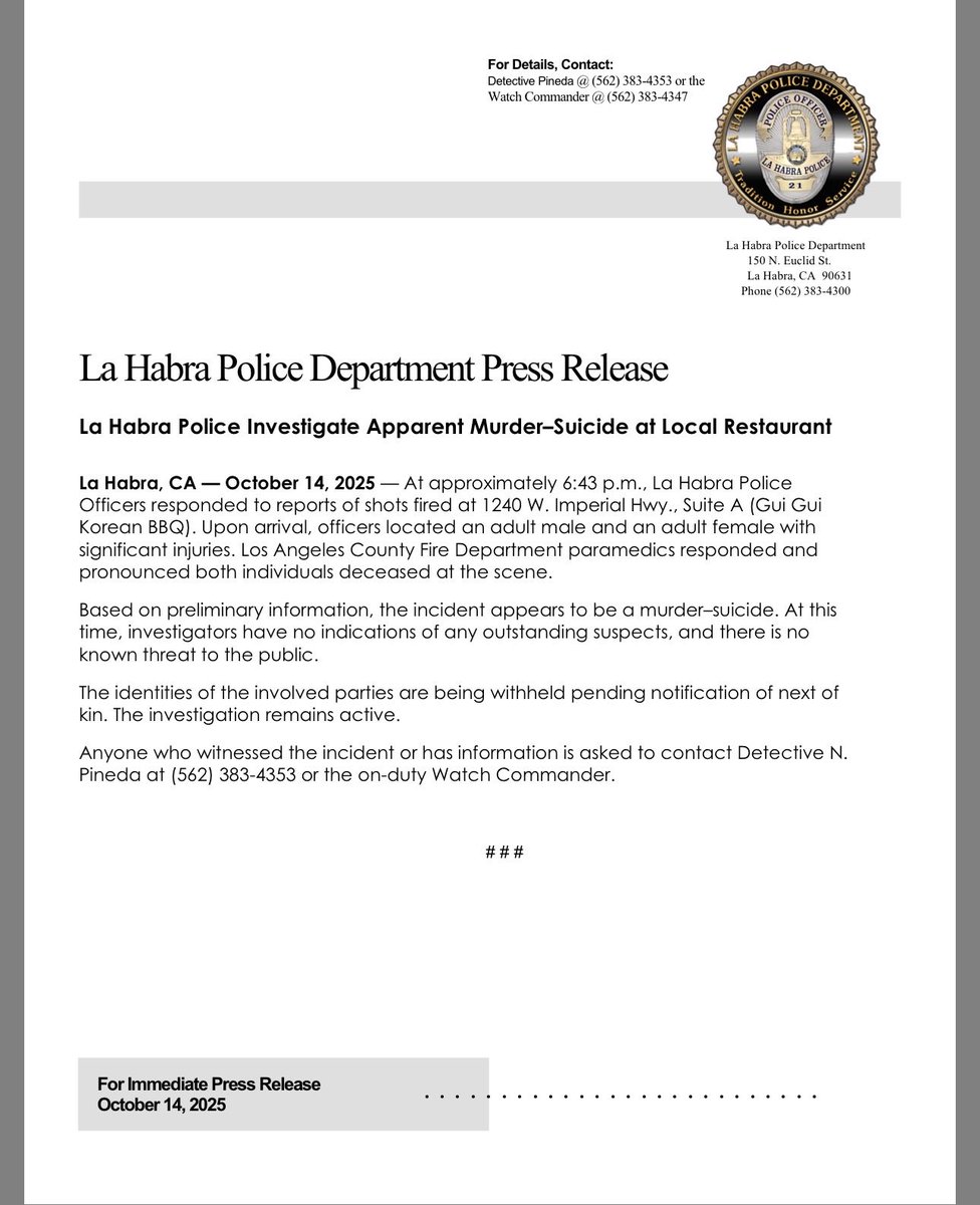 BREAKING 🚨🚨 #LaHabra / #California At approximately 6:43pm this evening La Habra Police responded to a shots fired call at 1240 W Imperial Hwy (Gui Gui Korean BBQ) due to a report of shots fired. Officers and LA County Fire Paramedics responded and located an adult male and