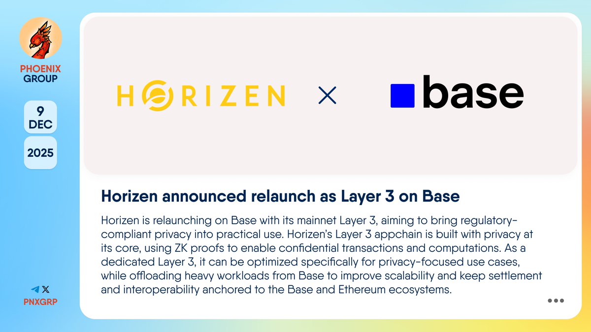 🔥 @Horizenglobal announced relaunch as Layer 3 on @Base #Horizen is relaunching on #Base with its mainnet #Layer3, aiming to bring regulatory-compliant privacy into practical use. Horizen’s Layer 3 appchain is built with privacy at its core, using ZK proofs to enable