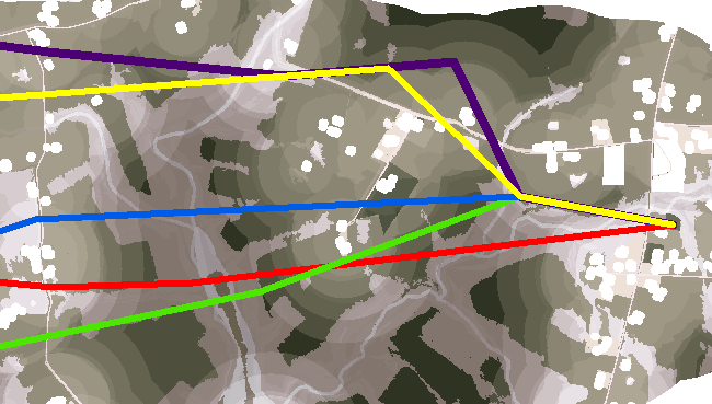 Data Dive: When planning T-lines, what's optimal placement? Our advanced modeling considers impacts on environment, community, & engineering to create viable route options. Learn more- bit.ly/3I0dlS4 graphic shows results of #transmission #linesiting route analysis