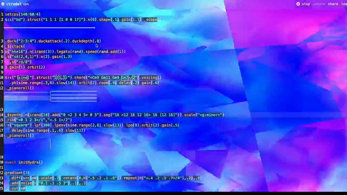 プログラミング(#strudel )で曲と映像を作りました。映像はstrudel内のHydraを使いました。 今回は #livecoding で曲の展開をさせています。動画内のコードをよくみると、ドラムを抜いたりシンセを入れたり、パラメータを変化させているのがわかると思います。